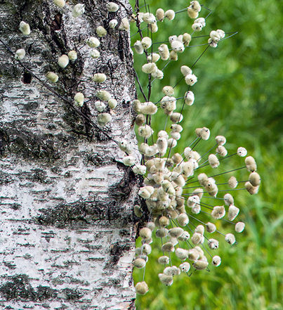 Un collier de perles enlace l'arbre avec, en guise des perles, des chatons végétaux et en guise du fil, de la corde à piano.